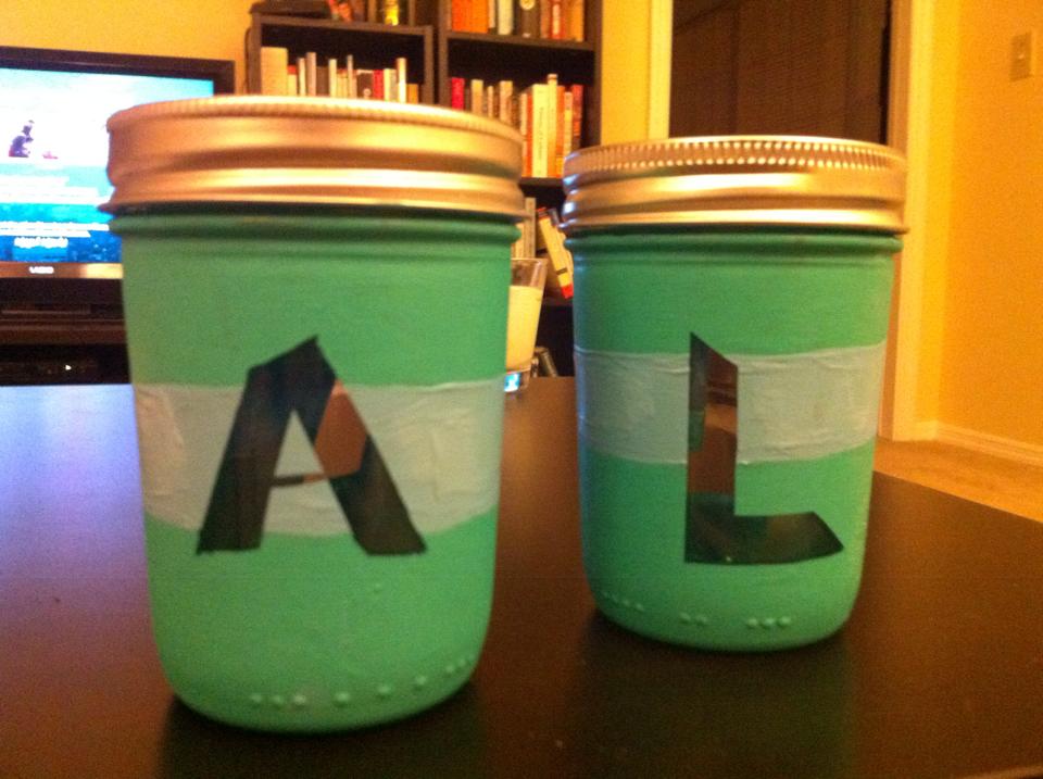 First use the tape and scissors to create whatever letter you would like to monogram onto the jar. We were making the jars for friends and chose the first letter of their name so an A and a L. We cut the tape into the shape of an A and L and then placed them onto the jar. Then place the another tape letter on the exact opposite side. You could place the exact same letter, or place a letter for their first name on one side and a letter for their last name on the other side, or if you are working with a larger jar you could place four letters around the jar in whatever variation you choose. The project is yours, so add whatever design or letter you would like. Next paint the jar, including painting over the tape, using whatever colors or pattern you like. Let the paint completely dry. Once dry, peel the tape off and you are left with a clear space that will allow the candle light to shine through. Afterwards place the candle into the jar and light it!