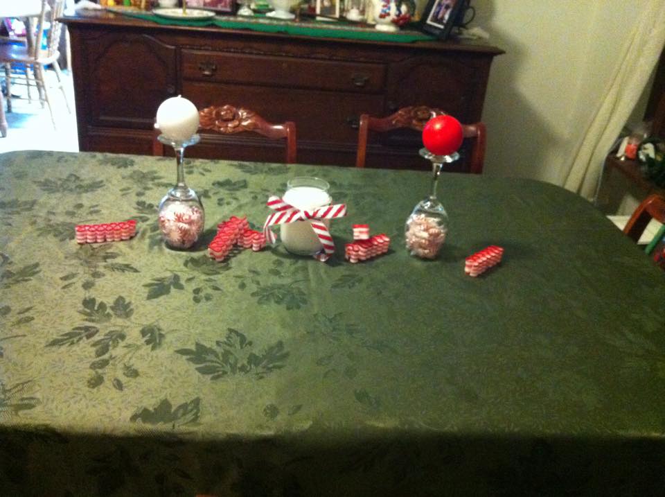 Using two wine glasses and candles we created a fun and unique peppermint candle display. We had bought two ball candles, red & white at Michael’s, along with a peppermint scented candle. Placing peppermints inside the two wine glass, we then flipped the glass over with the rim facing down and set both of the ball candles on the base of the glass. The wine glasses looked like candle holders and were filled with sweet treats for an inside decoration. Between the two wine/candle holders we placed the peppermint candle-filling the room with the smell of peppermint & candy canes everywhere!