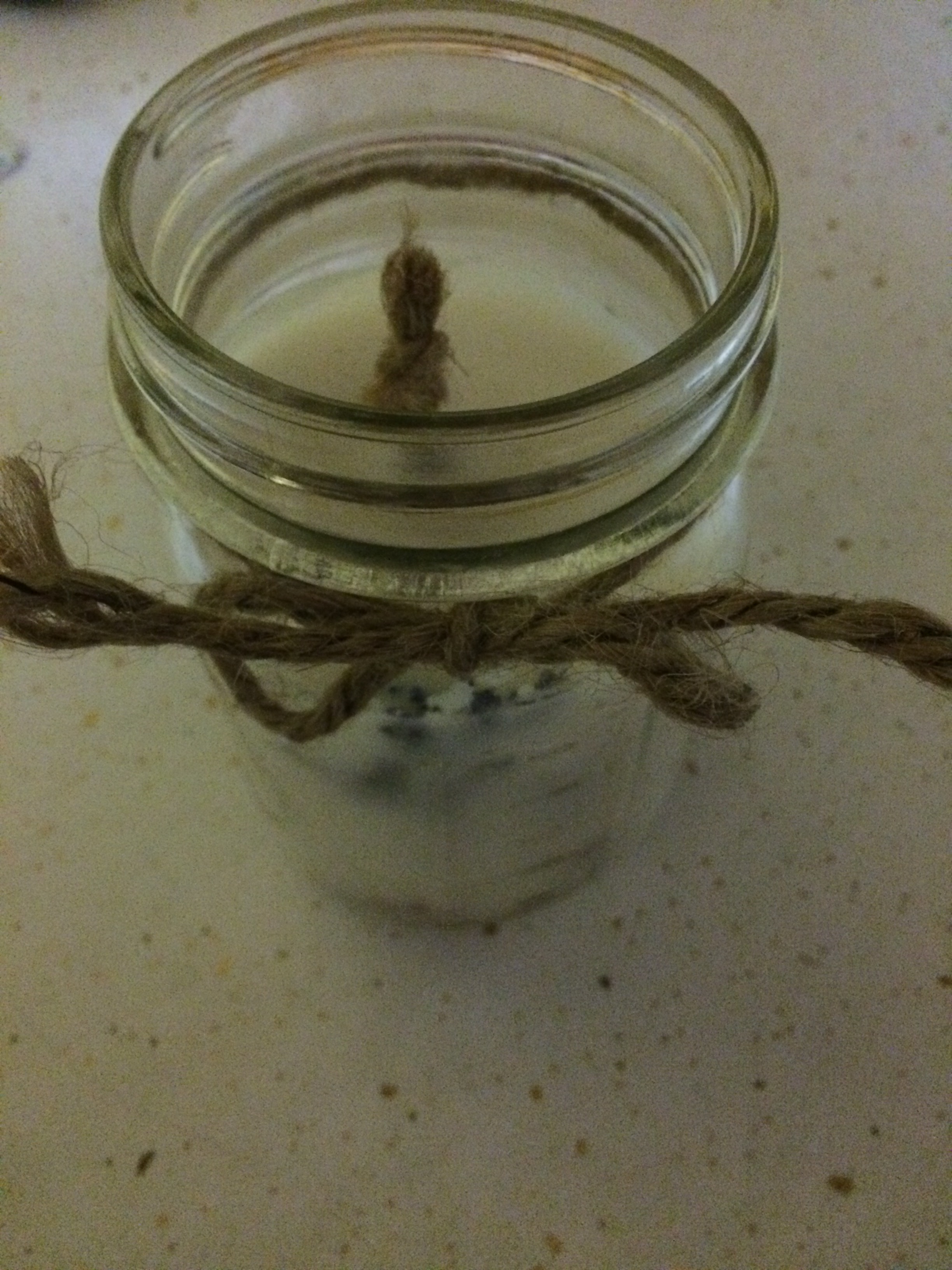 None of these items are specialty items and were things we just had around the house. For the wax, we simply used leftover wax, then empty mason jars, and basic twine. Place a jar filled halfway with wax into a pot filled partially with water. Having the jar in the pot of water helps to avoid ruining your cooking pots, plus all the wax is contained in the jar already-no need for hot spills! Place the pot over the stove at a medium temperature. While the wax begins to melt, you can make your own simple wick. Taking several pieces of twine, measure the length you need and then add additional length to give you room to braid and secure it once placed in the wax. Take three strands of twine and braid them together, then tie a knot on each side with extra string on one end. As the wax begins to melt, continue to add pieces of leftover wax until you get it at the candle height you desire in the jar. Place the wick into the melted wax. You can make sure it stays upright and centered by twisting it around a pen or pencil and resting it on top of the jar.