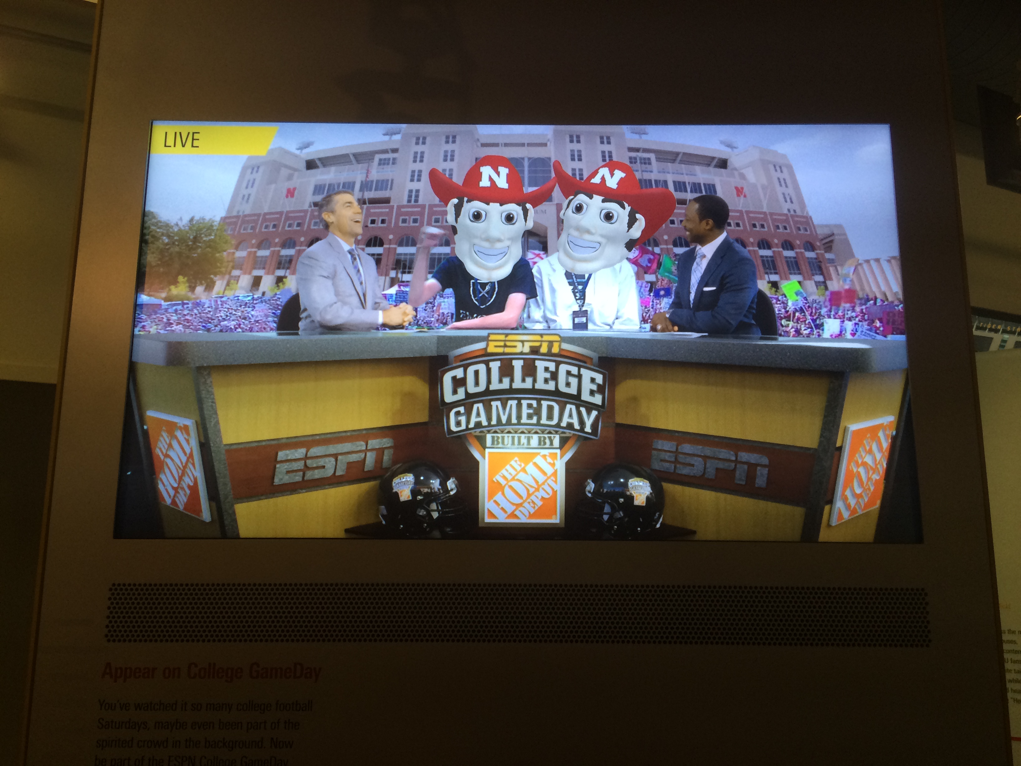 The second floor includes several exhibits, including an up close video of the college game day experience, displays on the history of the game, and several interactive games. For example, visitors are invited to sing their school’s fight song, record a spot from Sportscenter, and record their own call of a famous play.