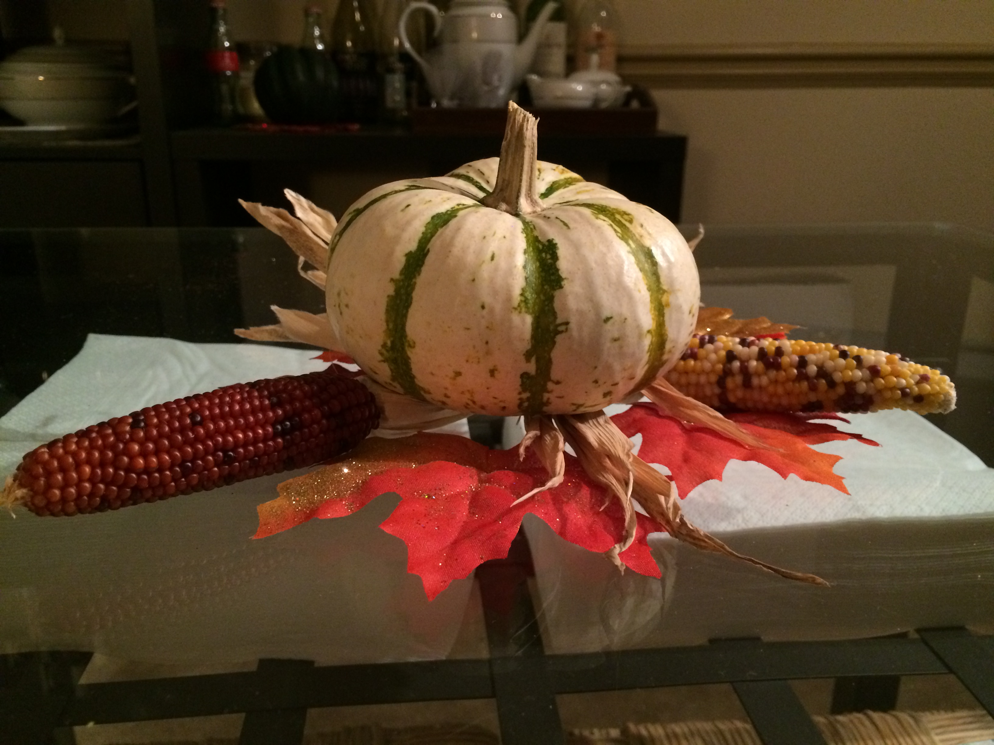 We are not the over-the-top decorating type, however, we do enjoy a few simple decorations to fit the season. Utilizing our glittery leaves and basic pumpkins, plus a little Indian corn, we created a warm festive look without spending a whole day gluing and crafting.