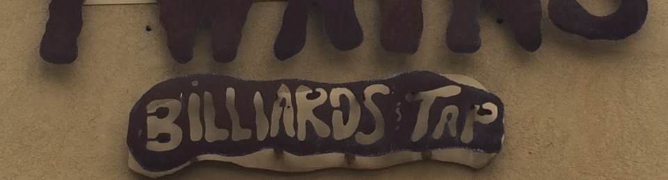 Twain’s Billiards & Tap is a brewpub located in the heart of downtown Decatur. As the name suggests, Twain’s has a billiard hall and their own beer, but Twain’s also has a restaurant and a large drink list in addition to their taplist. The restaurant is in the front of the building and includes eclectic furniture and decor. There is a large fish tank that greets the eye when one walks in and pages upon pages of the works of Mark Twain displayed on the walls. In addition to the literary aspect of the walls, there are also pieces of art produced by local artists and some other, more kitschy pieces. The seating area was large, but individual tables and booths were quite spread apart, providing ample room for patrons. One highlight of the seating arrangement was the large reclaimed wood table tops that provided elevated seating for those who like sitting on stools. Beyond the restaurant are two large rooms devoted to billiards.