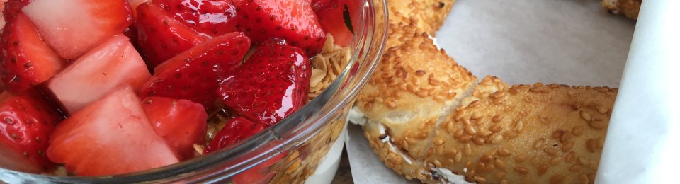 We are big fans of Chobani Greek yogurt and have it frequently. When we were walking through SoHo the other day, we noticed that Chobani has a café in the neighborhood, and we had to check it out. We visited the next week and enjoyed our visit very much. Most of the restaurant’s dishes have, as one might guess, Greek yogurt as the centerpiece. There are selections of yogurt cups and smoothies, but also a few salads and sandwiches. We each had a bagel with Greek yogurt and shared a Greek yogurt cup with strawberries, granola, and honey. We ate our food in the café, which was small but pleasant. It was very modern with a white and grey/black color scheme and some wood elements. The best part of the café was the large windows that looked out at the street. The windows included seats below them, so we were able to eat our lunch next to the window for some nice sunshine. Our food was very good, and we enjoyed our time at Chobani. The yogurt company is adding stores around the country, so we recommend stopping into one when you find one.