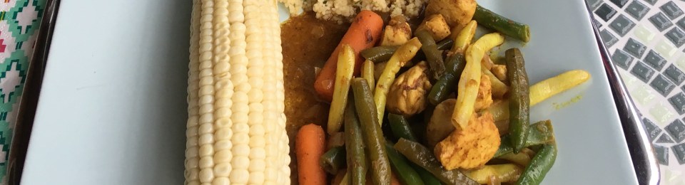 Mix 4 tablespoons of Vindaloo spice, 4 tablespoons olive oil, and 4 tablespoons of water. Cook the chicken to taste, either baking it or heating it on the stove in some olive oil. After it has cooled, slice the chicken into bite-sized pieces. Dice and saute one onion. Then, add 3 tablespoons of vinegar and the Vindaloo, olive oil, and water mixture into the pan, mixing thoroughly. Cook for 2-3 minutes, then add the chicken, 3/4 cup water, and the frozen vegetables (we used a mixture of carrots, green beans, and string beans) to the pan. Cover and simmer for 15 to 20 minutes. Uncover and cook for several more minutes until the Vindaloo reaches the desired taste and consistency. The final dish was flavorful and filling, and we enjoyed trying it.
