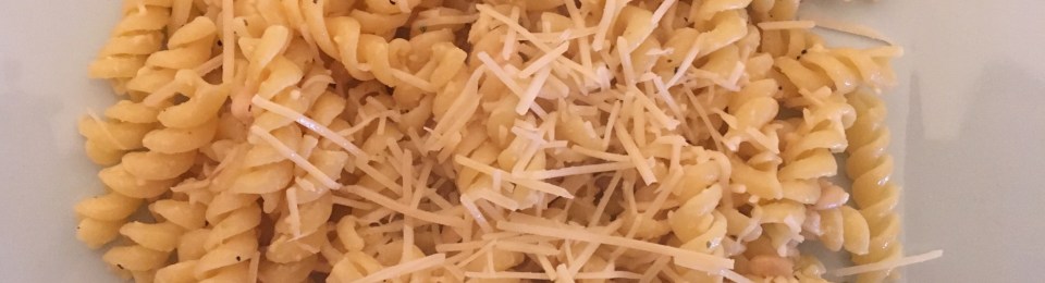 Begin by cooking the pasta, while the pasta is cooking mix the lemon juice, olive oil, garlic, oregano, pine nuts and Parmesan in a bowl. We do everything to taste, but approximate measurements were 1 lemon, 1/4 cup of olive oil, a teaspoon of garlic, a teaspoon of oregano, 1/4 cup of Parmesan, and 2 tablespoons of pine nuts. After the pasta is cooked, drain the pasta, and place it back in the pot. Next, add the blend to the pasta and mix. Afterwards, plate, add a little Parmesan to the top, and if you like, some crushed red pepper. Since we added the blend immediately after draining it, the blend soaked into the pasta nicely, and all of the flavors mixed well to create a refreshing summer dish with a little crunch.
