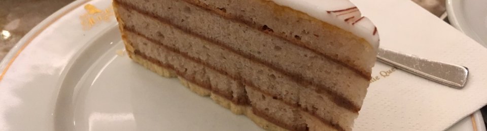In Vienna it is commonplace for theater-goers to visit a cafe afterward in order to discuss the performance. After seeing Don Pasquale at the Vienna Staatsoper, then, we ventured to nearby Cafe Mozart to join in this decades long tradition. Cafe Mozart is located across the street from the Albertina art museum, which is just down the street from the Viennese opera house. The cafe has been open since 1899 and is located inside a beautiful white building with a lovely outdoor patio. We, however, chose to sit inside. The interior is brightly lit, with cream colored walls and a light tiled floor. There is still plenty of wood as in a typical Viennese coffeehouse–around the bottom of the walls, the display cases, and the chairs–but it is a bit lighter in color. Small tables with Thonet-style chairs fill the space, along with cozy booths covered in an elegant red fabric. When you first walk in, however, you are met with a lovely display case filled with delicious cakes and pastries. While Cafe Mozart serves breakfast, lunch, and other food, we just ordered coffee and cake, as is typical at Viennese coffeehouses. We had a Mango-Yoghurt Dreieck, a cake with mango mousse, and an Esterházy Torte, an almond cake with amaretto cream. Both of our cakes, as well as our coffee, were delicious. We enjoyed Cafe Mozart and visiting was the perfect way to end our evening at the opera.