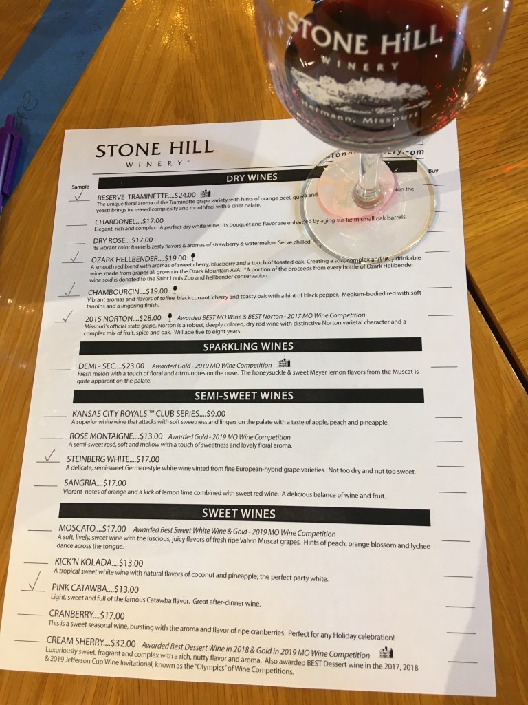 Stone Hill has an assortment of red, white, rosé, sparkling, and dessert wines, as well juice. The winery has won several awards, including several incorporating the Norton grape. The Norton grape is well-known throughout Missouri wineries and Riedel stemware was actually created specifically for the Norton grape. (We highly recommend utilizing the stemware – it brings out flavors in a completely new way!) When we visited the winery we participated in a wine tasting and the winery as packed, so we definitely recommend trying to visit on a week day. We mainly tried the reds, since we prefer reds, and found the wines to be nice for a meal at home. Overall, we found the winery grounds to be beautiful and enjoyed the opportunity to try one of the oldest wineries in the country.