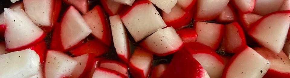Begin by dicing up the radishes. Some people do not like the skin, so if you don’t, remove it first, and then dice up the radishes. Place in a owl, and add the white wine vinegar, olive, pepper, and sugar to taste. Allow to sit overnight if possible. The following day you are left with a colorful little side dish!