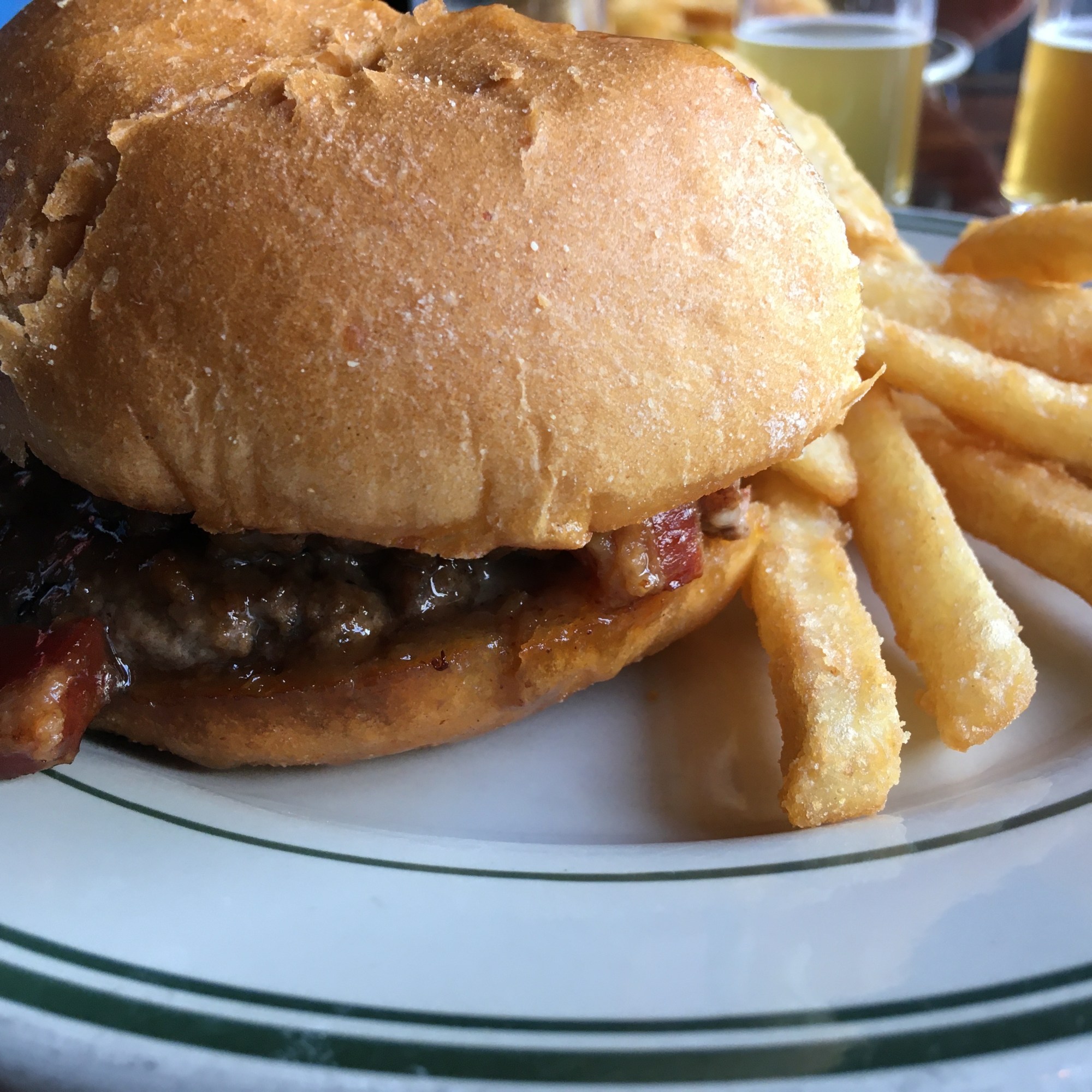 Main & Mill is both a brewery and a restaurant, and provides visitors with a nice array of good options of both beer and food. The food is classic pub-style, but elevated to incorporate some great flavors with daily specials, appetizers, salads, sandwiches, burgers, and several entree dishes. When we visited we had a salad and the special of the day – an apple bourbon burger that was incredible! The burger was covered in a bourbon sauce with apples and onions, bacon, and cheese, and the flavors paired perfectly and deliciously together. We also had a tasting with four different beers and each one was light, good flavors, and well-balanced to create some great, drinkable beers. Both the meal and the beers were fantastic, and they offer pick-up! We definitely recommend visiting Main & Mill Brewery for tasty food and drinks.