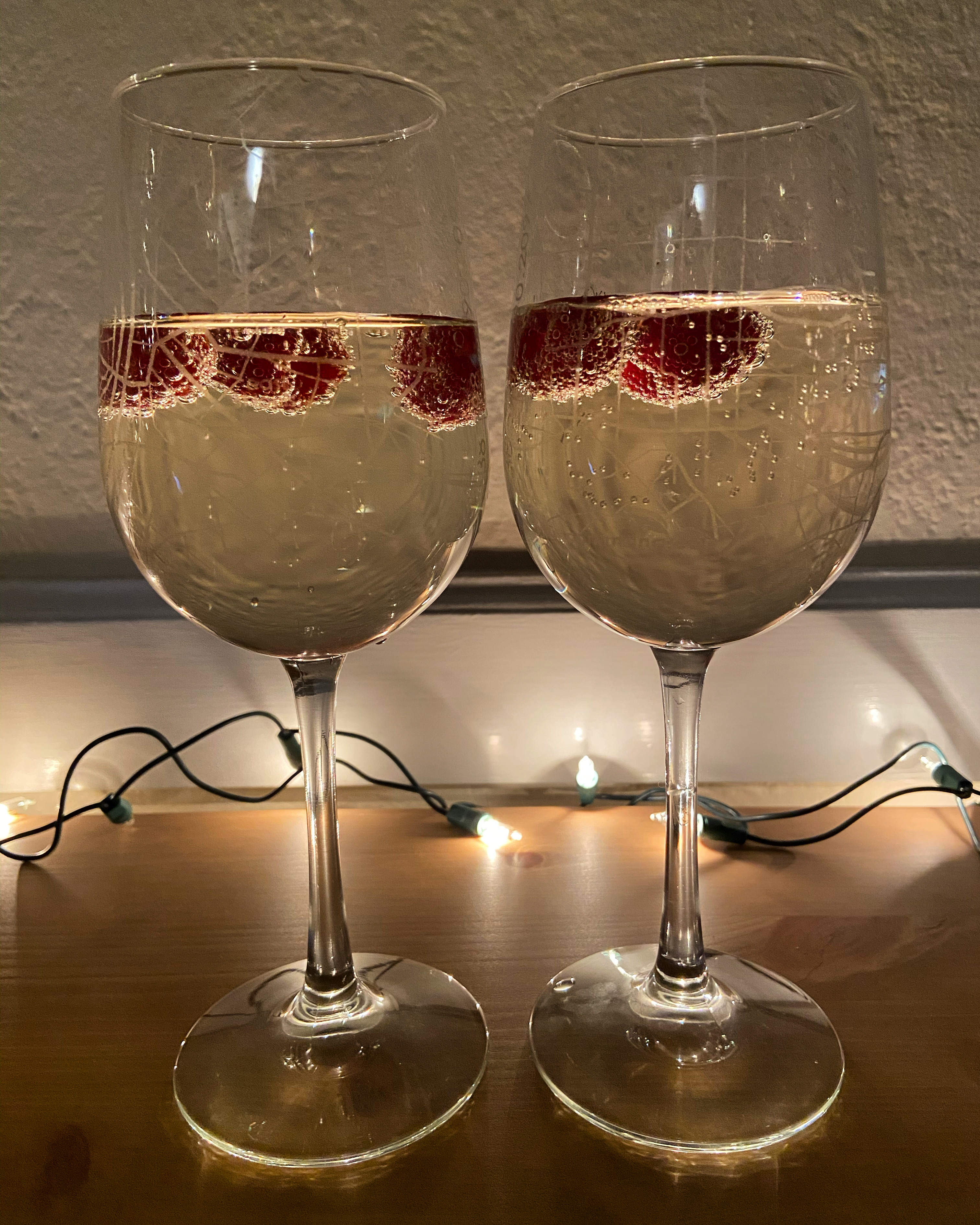 Place a teaspoon of elderflower syrup in a glass. Fill the glass with sparkling water a quarter of the way and stir. Add champagne to fill the glass halfway. Pop in the fruit of your choice and enjoy!