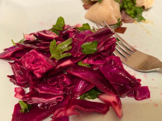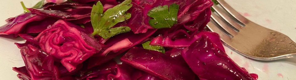 Begin by washing the head of red cabbage and halving it. You will only need one half of cabbage so can you use the other half for something else. Begin to chop the cabbage into smaller pieces and remove the innermost hard pieces. Once the cabbage is in small and manageable pieces, add it to a bowl. Drizzle white wine vinegar, olive oil, pepper, and salt to taste. Mix the ingredients and place the bowl to the side. Next clean and chop the parsley, and add it to the bowl. Mix again and allow it to sit refrigerated for at least 30 minutes for the flavors to begin to absorb. Serve chilled and enjoy!