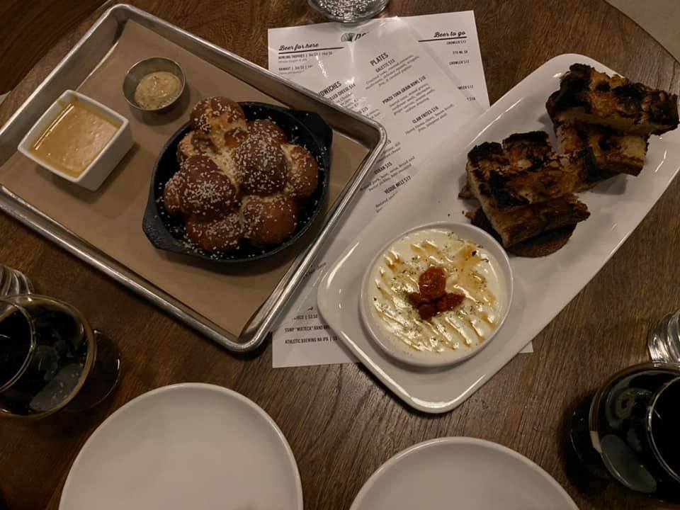 In addition to their drink menu, Perennial on Lockwood also has a food menu that features artisanal comfort food. There are an array of appetizers and sides, along with a few sandwiches and entrees. We decided to try a couple of appetizers and ordered pretzel monkey bread with accompanying mustard and beer cheese and whipped feta with toasted bread. We enjoyed the food and found that it paired well with our beers.