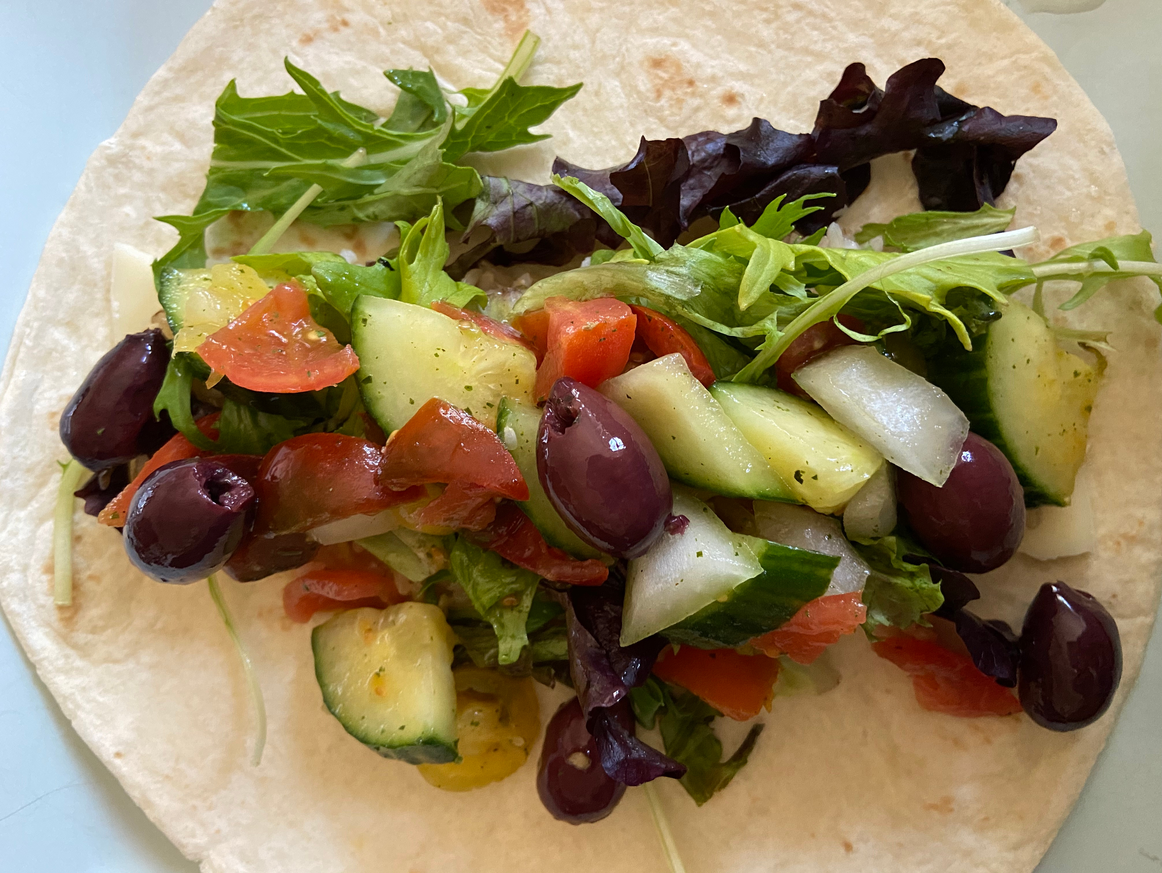 Choose your wrap of your choice, and then add some lettuce. Afterwards top with veggie salad, which creates the perfect wrap marinade for the wrap and gives a great consistency of a little crunch with the tomatoes, cucumbers, and onion. Then top with olives and cheese if you would like for a tasty and flavorful wrap.