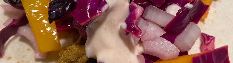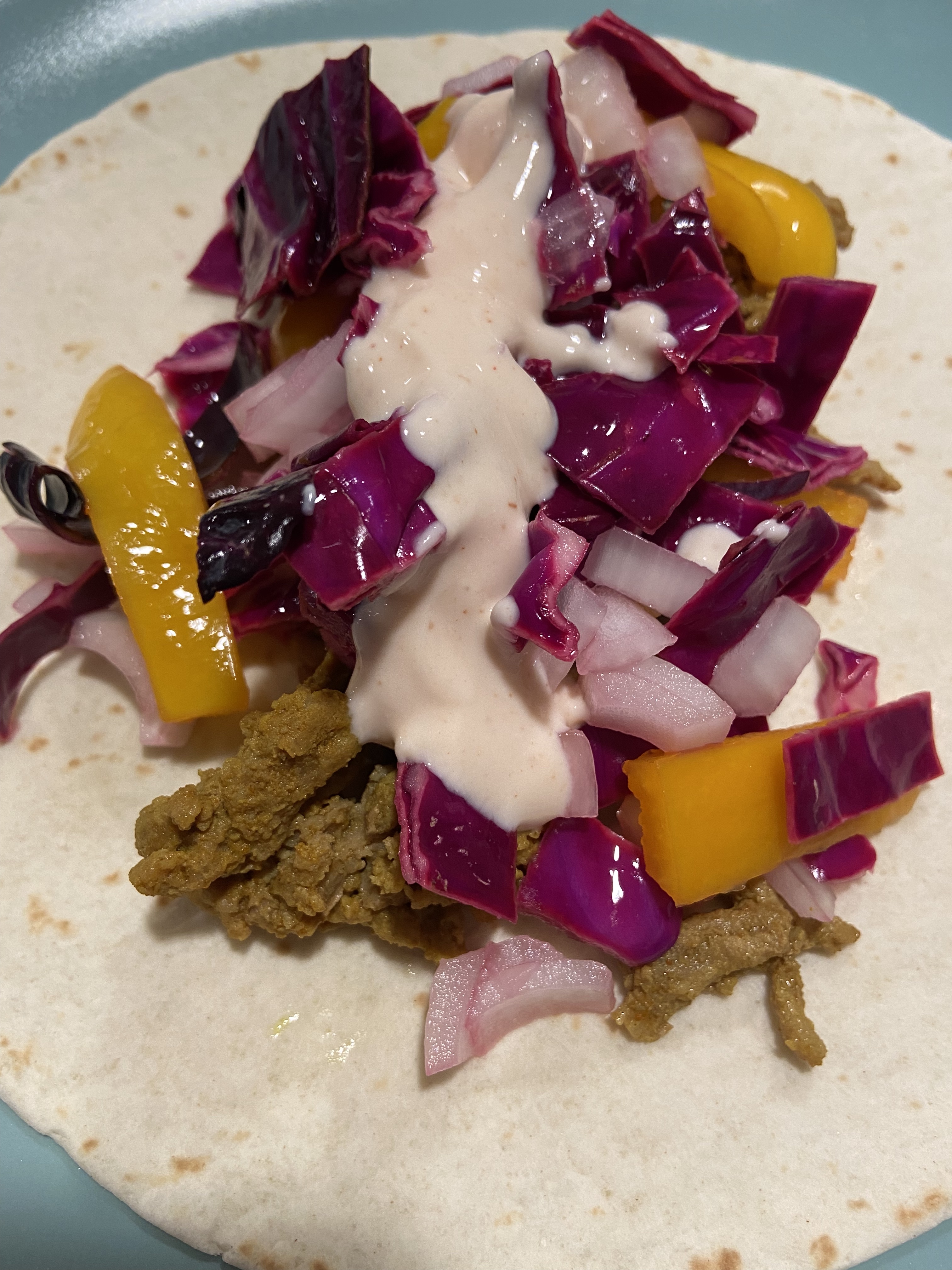 Begin by placing ground turkey in a frying pan and begin to heat it up. We added cumin and turmeric to the turkey, but you can flavor it how you would like. Next chop half a red cabbage, 1-2 bell peppers, and an onion. Place them in a bowl and add herb vinegar to taste. In a separate bowl mix Greek Yogurt and sriracha to taste for a creamy drizzle. Once the turkey has finished cooking, place it in a tortilla, add the pickled veggies, and drizzle to taste. If you desire, you can add a sprinkle of cheese!
