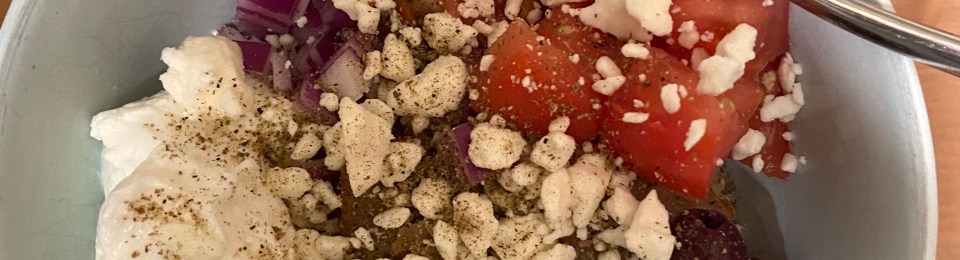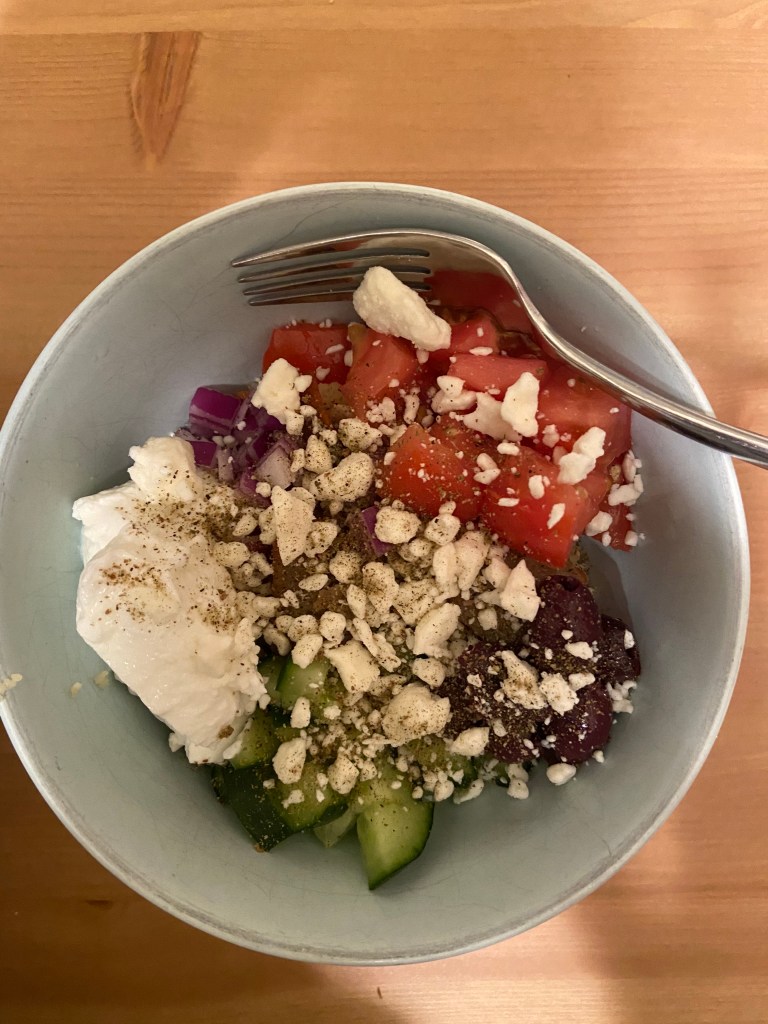Cook the grain as instructed. We typically use brown rice or couscous and enjoy both, but other grains, such as quinoa, would also be good options. Dice the cucumbers, tomatoes, and onions into small chunks. Then, heat up the gyro meat on the stove top. When everything has finished cooking, place the grain in a bowl. Add the meat in one corner, then the veggies in different areas of the bowl. While you can simply throw each of the items in, placing each of the ingredients in one corner of the bowl can make for a fun presentation. Top the bowl with feta cheese and a large dollop of plain Greek yogurt. You can also add some hummus if you desire. The Greek bowl is an easy, healthy, but flavorful, meal that we enjoy often.