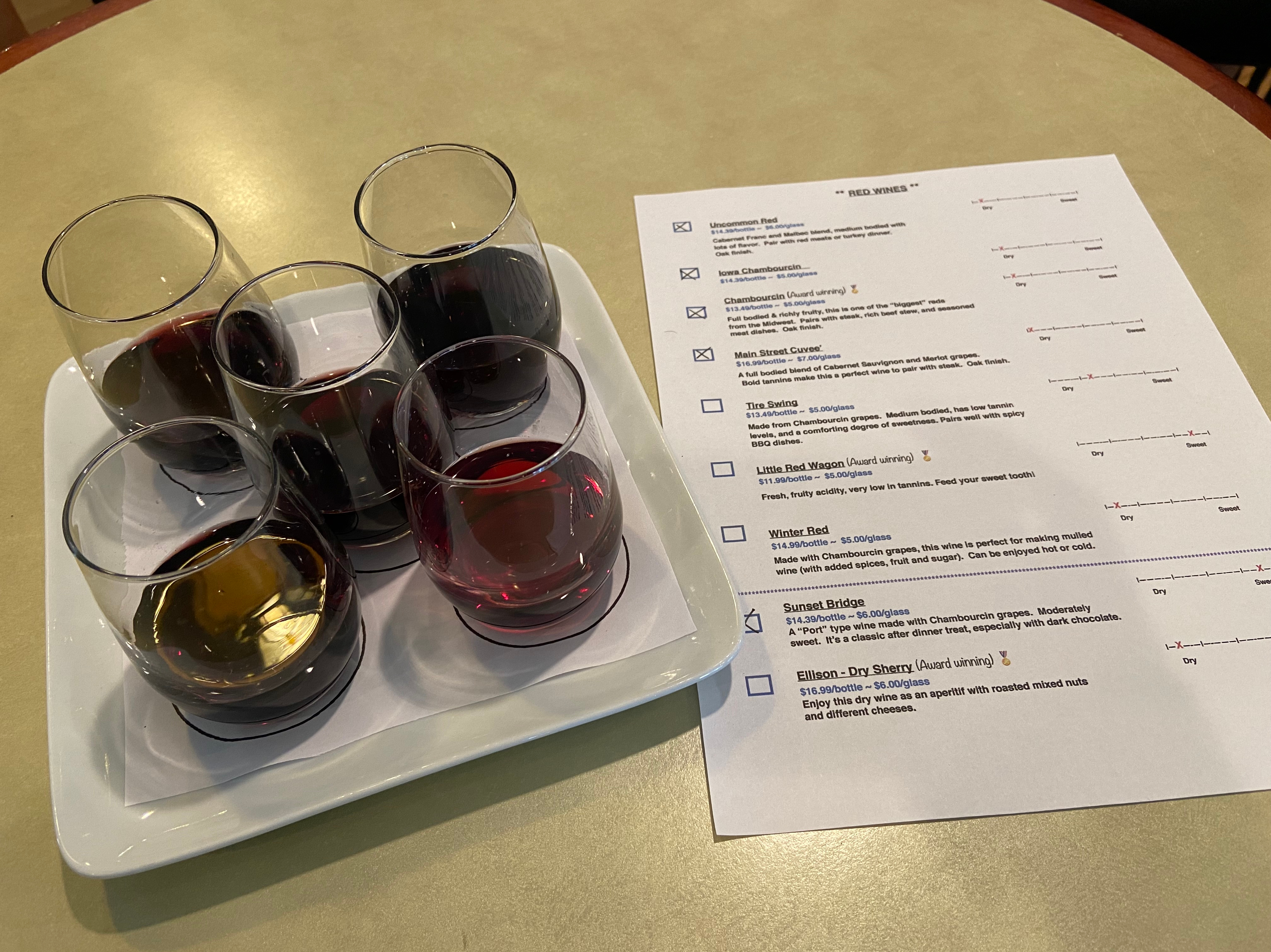 During a recent visit to the Herbert Hoover National Historic Site in West Branch, IA, we decided to stop off at Brick Arch Winery. The winery is located along Main Street in the heart of the quaint little town. The main strip backs up to the National Park Site, making it an ideal stopping point to explore a little further. Brick Arch Winery is on the corner of the street in two separate buildings that have been converted to encompass the winery. Visitors enter through a brick building with brick arches as the name suggests. Upon entering the room consists of a long bar for visitors to partake in tastings on one side, and an assortment of wine-themed goods on the other side. There is an opening into the second room, which is actually located in the second building. The second building is a two-story yellow sided building. The room features a large stage area that houses an old brick arch embedded into the wall, and then a variety of tables and chairs around the room. The room is open to the second floor, providing additional seating options for visitors to sip their wine at and enjoy a performance.