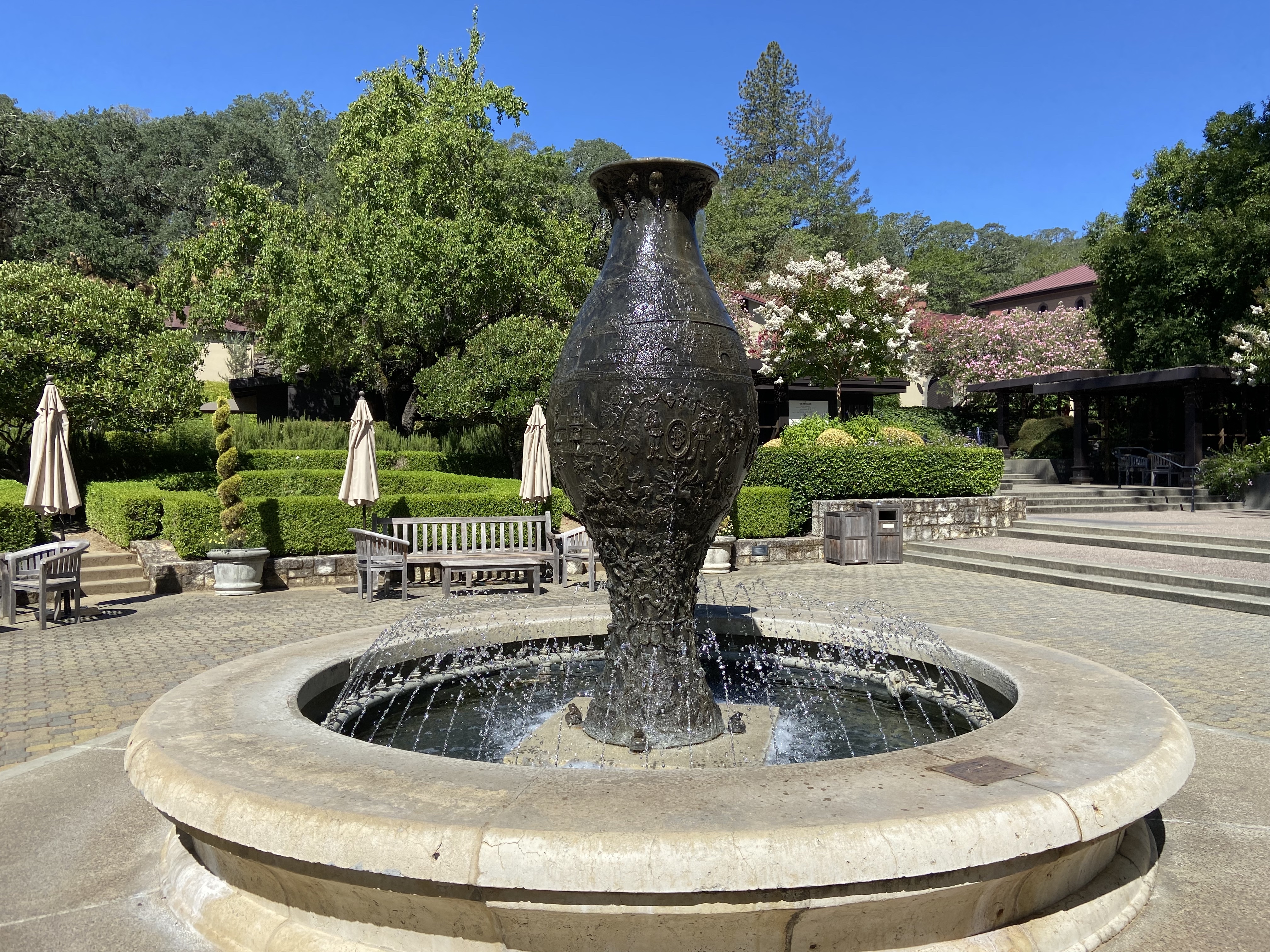 While Beringer’s vineyards are located in various places in Napa Valley, the tasting room stands just north of St. Helena off the valley’s main road. The property is rather large, but the centerpiece is the Rhine House, a beautiful yellow stone building inspired by German architecture. The grounds around the house are well-manicured and give visitors the sense of being in their own little oasis. We were able to look around the beautiful and ornate interior with rich woods and stained glass, but had our wine tasting on the patio behind the Rhine House amongst the landscaping. The setting was peaceful an relaxing.