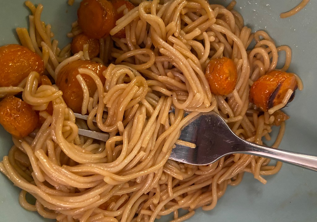 Start by preheating the oven to 400 degrees and then chop the carrots into small pieces. Drizzle with olive oil and sprinkle with garlic and rosemary. Bake the carrots for 20 – 30 minutes, depending on your texture preference. While the carrots are baking, prepare the ramen noodles. Once the ramen is cooked place the sesame oil and garlic cloves into a pan or wok. Once the sesame oil and garlic cloves are warmed, add the ramen. Evenly coat the ramen. Next add soy sauce and brown sugar to taste. Finish by placing the baked carrots in the pan and mix. You are left with a garlicky ramen dish!