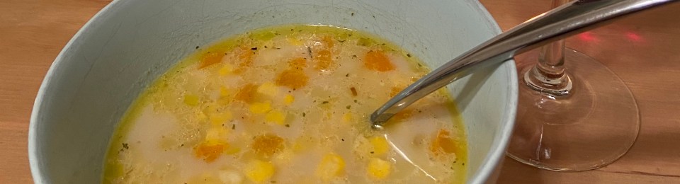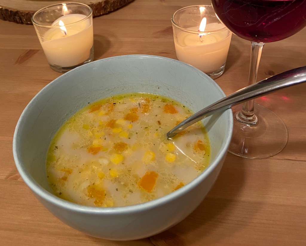 This recipe is originally from Savory Spice; however, we tweaked the recipe to our own preferences. Heat up a drizzle of olive oil. While the olive oil is heating up, cut up a pepper and potato. Sprinkle flour into the pan and heat the vegetables until they are slightly softened. Add garlic and your preference of spices (we used the Nantucket Herb & Citrus Rub). Prepare a bouillon cube and then add the bouillon cube, a packet of frozen corn, and milk to the pot. Bring to a boil and then simmer until the potatoes are soft. Once the soup is finished, serve and top off with a seasoning of your choice!