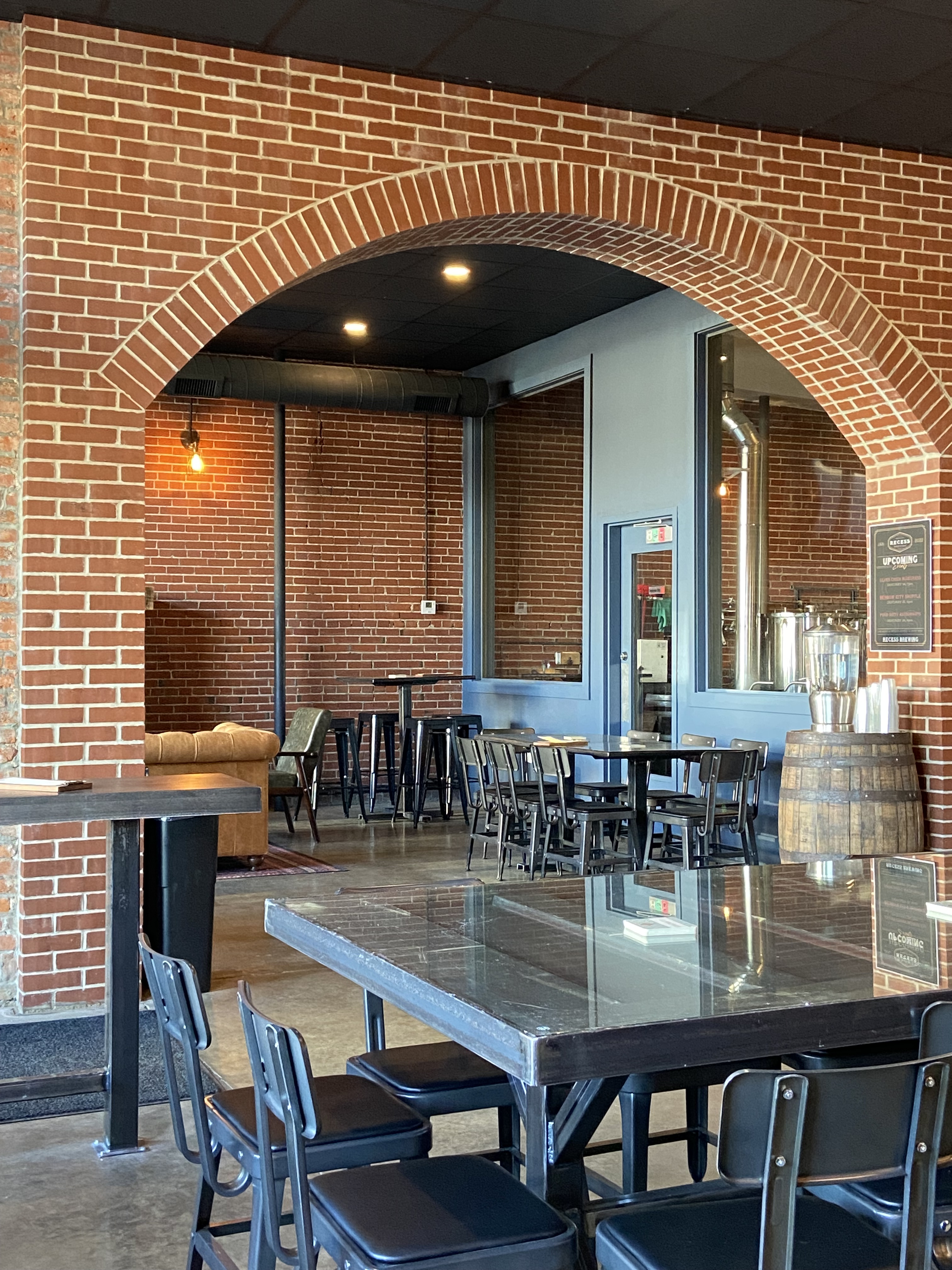 Inside, the brewery is modern, but cozy, featuring lots of brick on the walls and dark colors. To the left, in a room looking into the brewery, stands a couch in front of a nice fireplace. A beautiful brick archway divides this room from the right side of the interior, which includes tables and chairs for seating and nice bar area.
