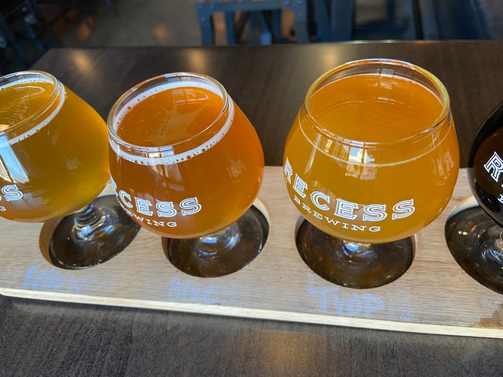 The brewery serves a number of their beers, which include both traditional styles and more experimental takes. For those wanting to try more than one, Recess offers tasting flights. We tried an American lager, a vanilla coffee oatmeal stout, and two sours, one with blueberry and one with mango, papaya, and coconut. We enjoyed tasting each of these and found Recess to be a relaxing place to stop if you’re in Edwardsville.