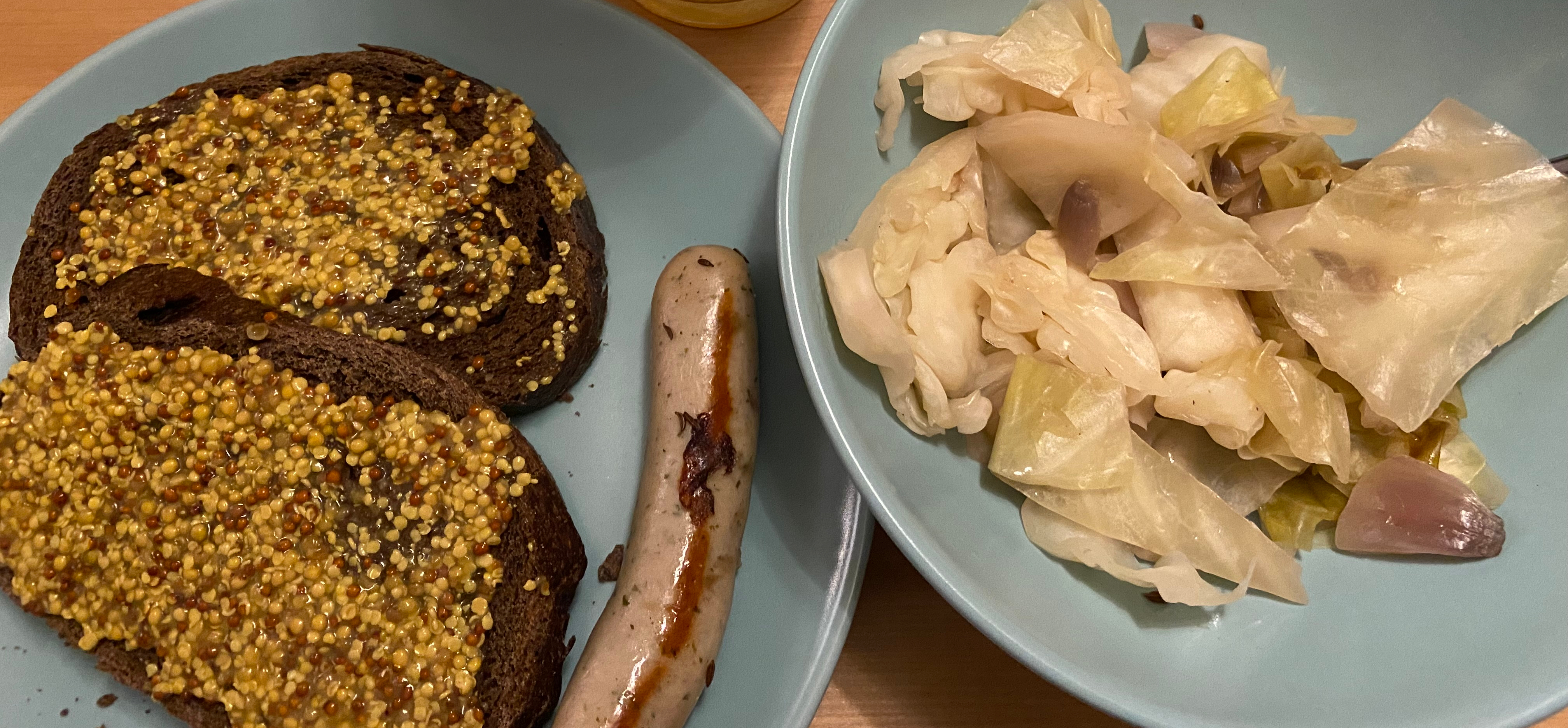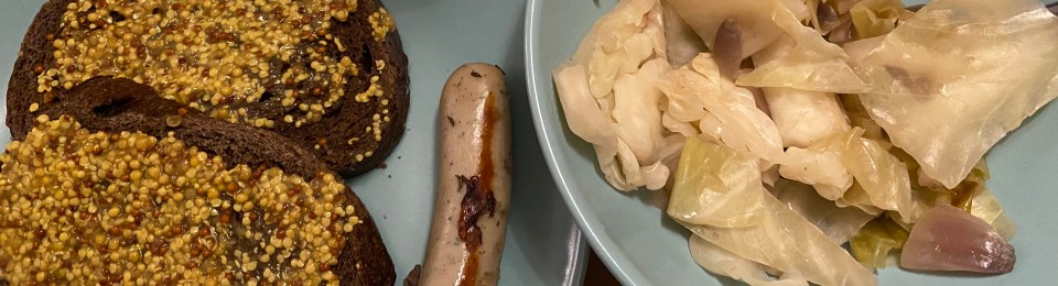Begin by cleaning and chopping up 1/2 a head of green cabbage. Our crock pot is small, so if you have a larger crock pot you can double this recipe. Chop up a small red onion and place the green cabbage and red onion in the crock pot. Sprinkle in pepper and salt to taste. We typically avoid salt in recipes, but for this recipe we recommend using it to help the green cabbage maintain a slight crispness. Next prepare a bouillon cube with one cup of boiling water. We used a chicken stock, but if you are vegetarian, feel free to supplement it! Pour in the cup of bouillon cube and a separate cup of water. Next drizzle apple cider vinegar in the crock pot and sprinkle caraway seeds. Mix everything and then place the bockwurst on top. Heat for a minimum of four hours. We had the crock pot on low for two hours and then two and a half hours on high to really allow the flavors to absorb. Afterwards remove the bockwurst and pan fry for a nice outside coloring. Place and enjoy! We had the bockwurst with some pumpernickel bread and grain mustard with a side bowl of the cabbage. It was delicious!