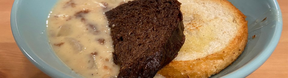 Begin by chopping the onion and preparing the broth in a large pot. We typically use a bouillon cube or a vegetable broth. For the bouillon cube, we use the Knorr Vegetable bouillon for this recipe and doubled the water, so we utilized one cube and four cups of water. Next pan-fry the bread in olive oil or butter if you choose. Add the onion to pan and roast a little. Sprinkle in a little bit of flour. Move the pan ingredients into the pot. Crush a couple of pieces of garlic and drop into the soup. Bring the soul to a boil and then simmer for 30 minutes. While the soup is simmering, beat two egg yolks and cream together in a separate bowl then pour into the salt. Sprinkle in the seasoning of your choice, we utilized pepper and nutmeg, and then top with parsley.