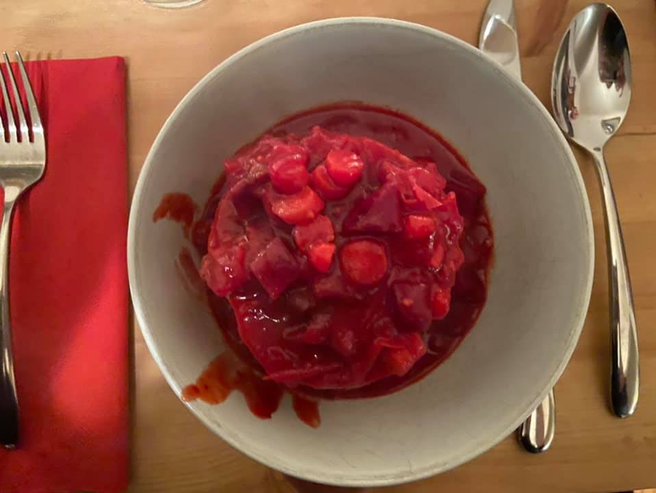 While the sauce is slowly simmering, preheat the oven to 350 degrees, and prep rice, based on your need. While the rice is cooking use whatever meat you choose and pan fry with a seasoning of your choice. Once the rice and meat is cooked, blend together and place in cleaned out bell peppers. If desired, you can add cheese to the meat and rice blend. Cook the bell peppers in the oven for around 20 minutes. Once the bell peppers are cooked, place in a bowl and pour the tomato sauce over the bell peppers. We like to keep the vegetables in the sauce to make the sauce a little heartier. Afterwards, you are left with a delicious sauce base that can also serve as a soup, along with well-seasoned delicious bell peppers!