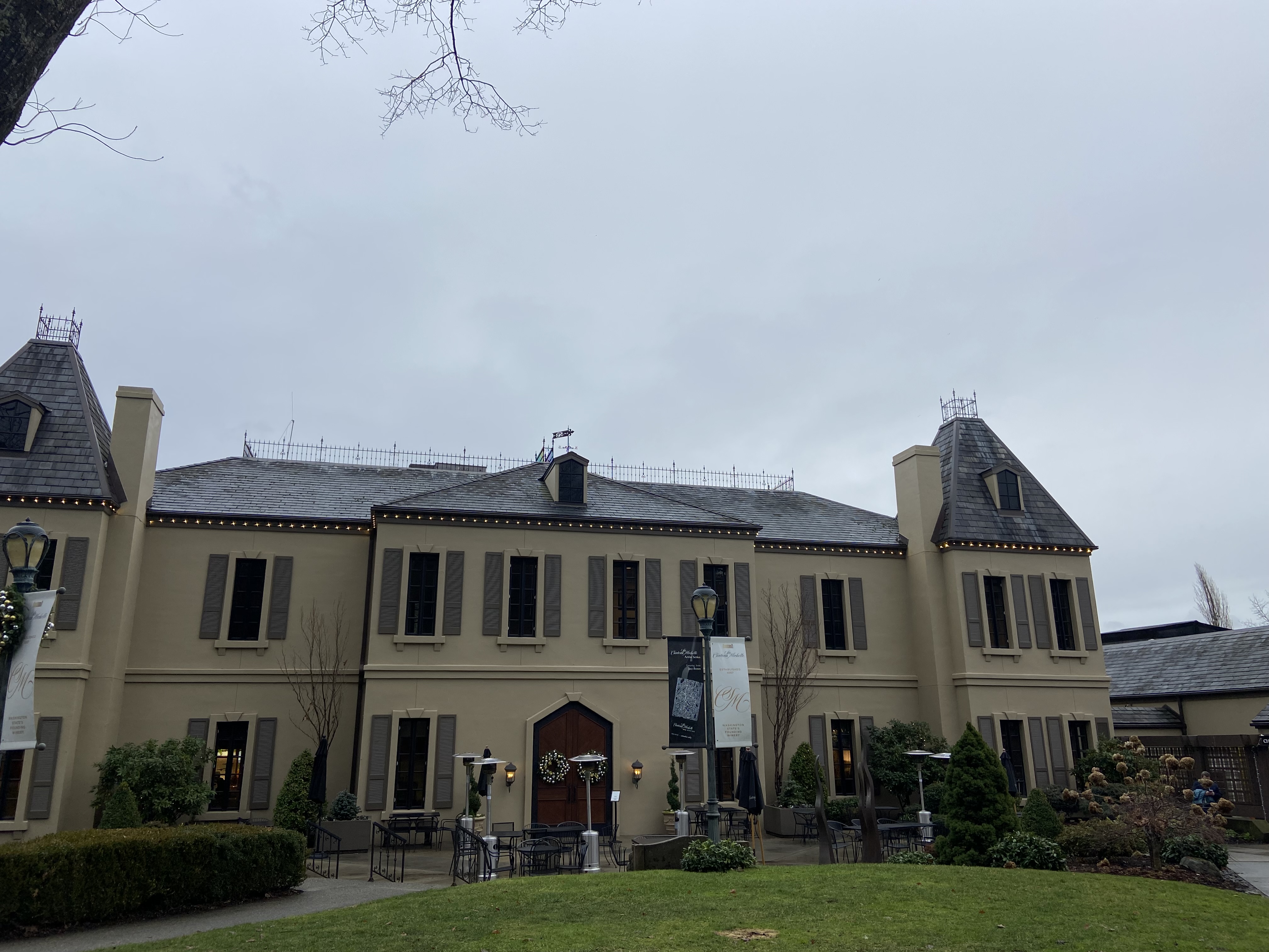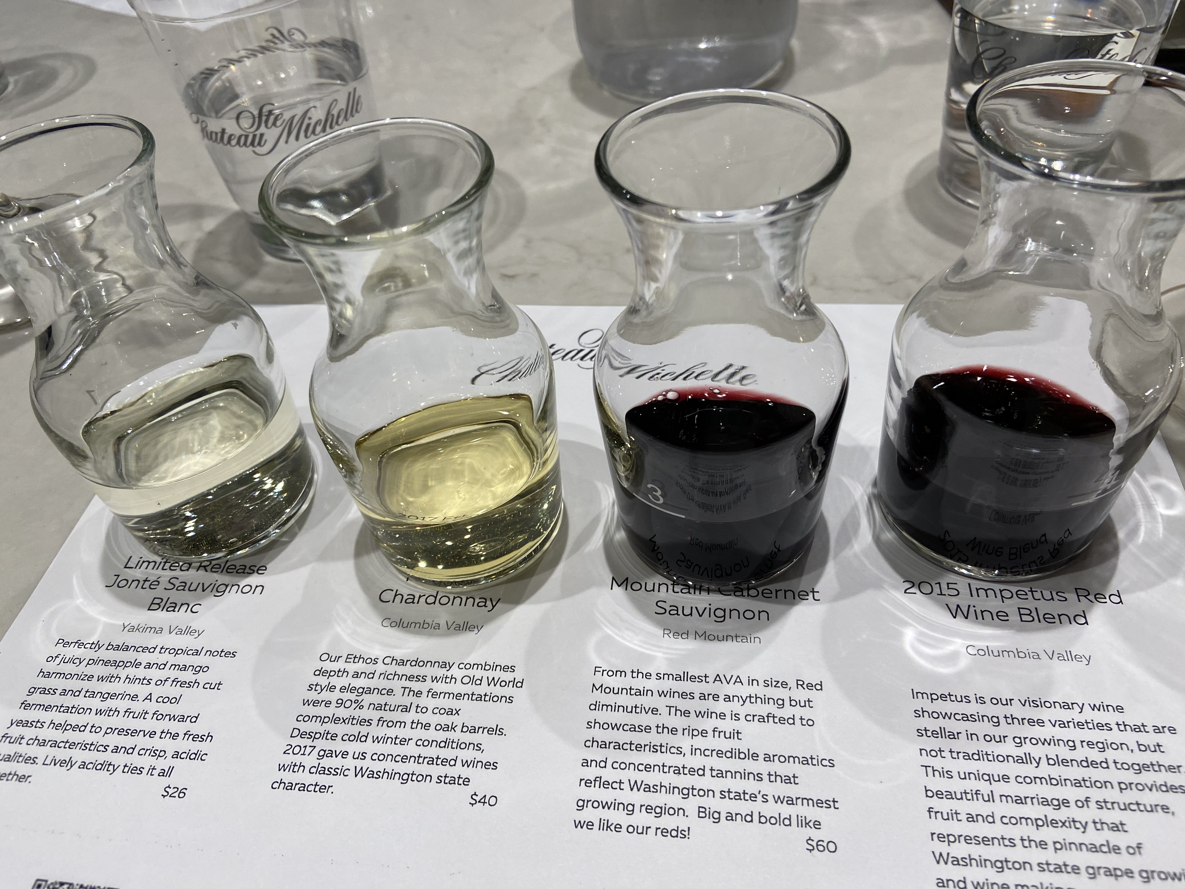 Chateau Ste. Michelle, which maintains it is Washington’s oldest and most acclaimed winery, is located in Woodinville, a north Seattle suburb home to a number of wineries. These wineries grow their grapes in the eastern parts of the state, but host visitors at their headquarters and tasting rooms in Woodinville. Chateau Ste. Michelle’s tasting room is located on a large tract of land with a beautiful chateau-style building. The tasting room itself is rather large with a sleek, modern look–concrete floors, dark colors, marble countertops, rich wood stylings, and minimalist lighting.