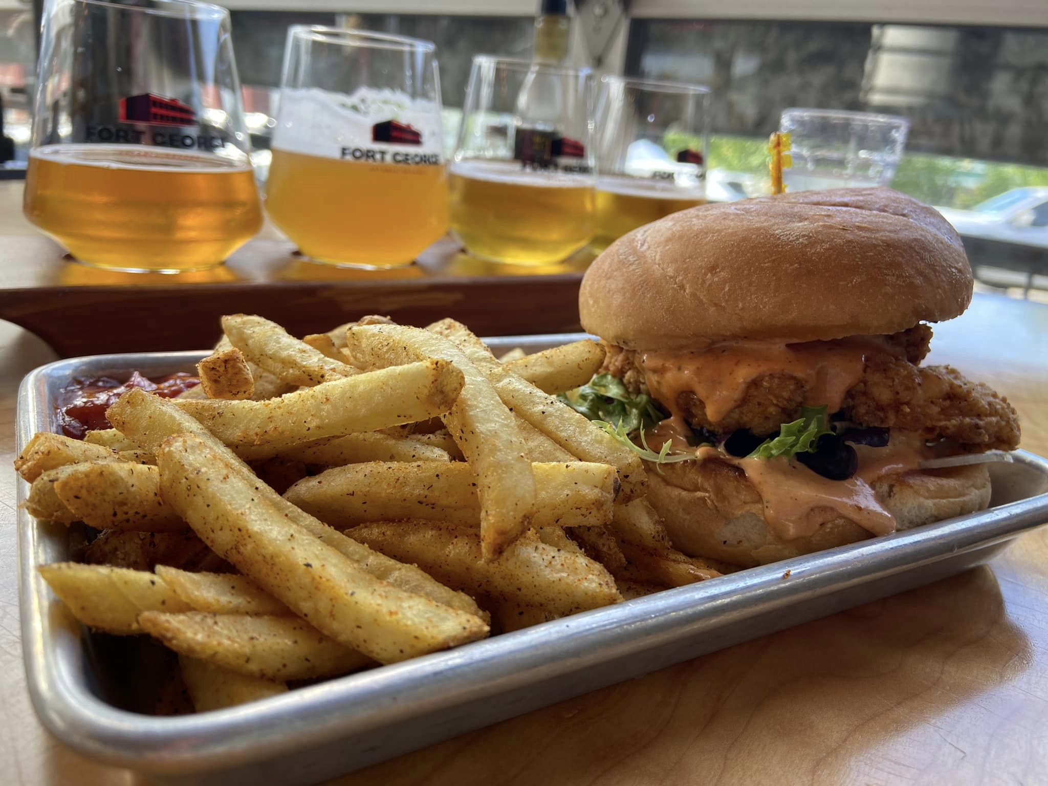 The brewpub actually has two separate menus, one for the second floor, which features pizzas and salads, and another for the first floor. We ate on the first floor. The menu features typical pub food, such as burgers, chicken sandwiches, soups, and salads, along with a few fish dishes and appetizers like wings, fries, and hummus. We enjoyed a salad and a chicken sandwich, both of which were delicious. We also sampled a tasting flight. Fort George had a number of beers on tap from a number of different styles. Each of the beers we were able to try were well-brewed and tasty, whether they were brewed to style or were more experimental.