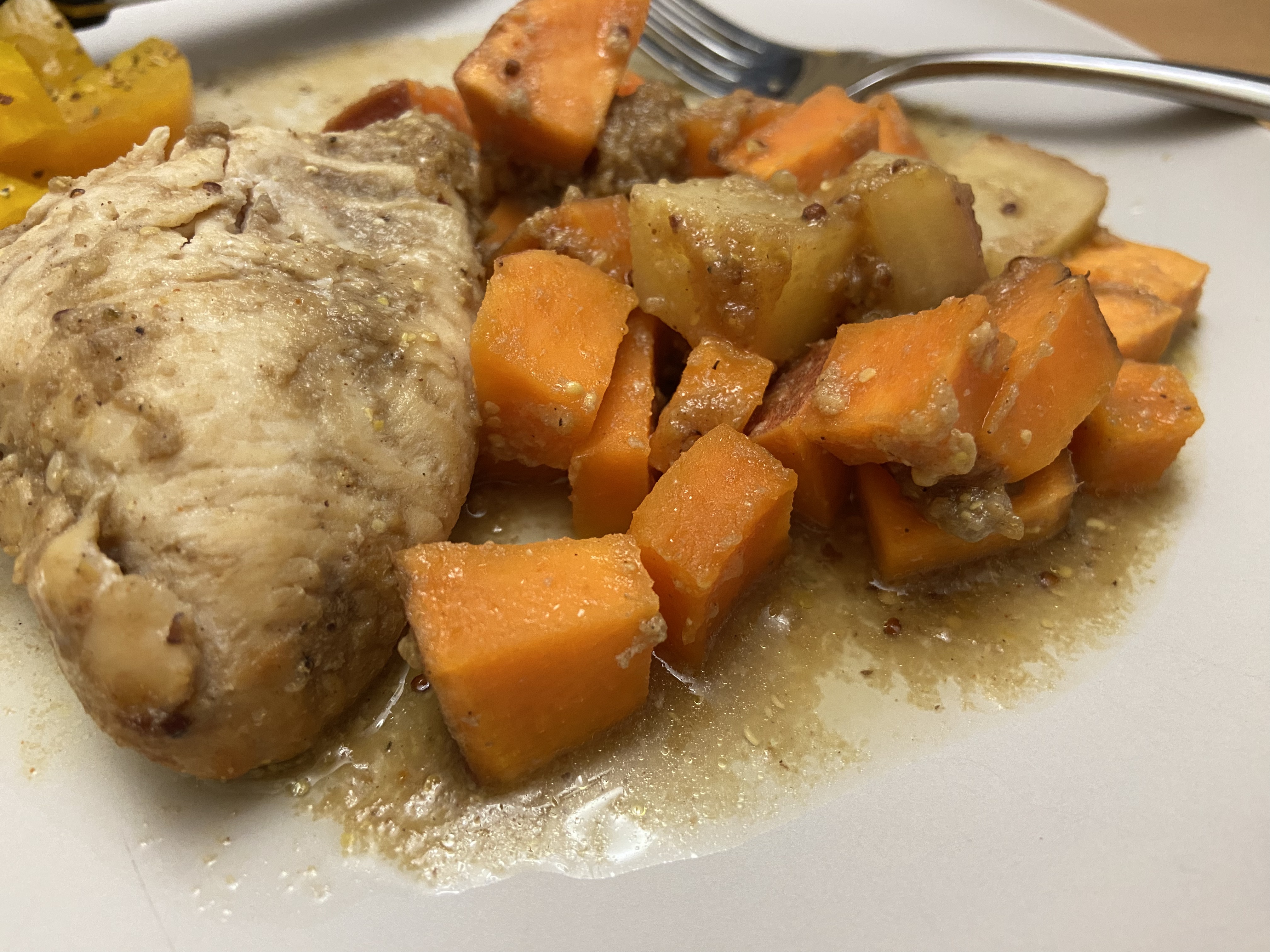 In a crockpot drizzle olive oil and apple butter. Then add apple cider vinegar, mustard, rosemary, thyme, garlic powder, pepper, and brown sugar to taste. Mix the ingredients, and then place the chicken breasts in the slow cooker and coat with the sauce. Cook on low for at least 6 hours or on high for at least 3 hours. After a couple of hours, chop up the sweet potato and potatoes and add to the crockpot. Allow the crockpot to simmer for a couple more hours to cook the potatoes. Add any additional seasonings if needed. At the end you are left with a full, flavorful meal that is easy to prepare and tasty.
